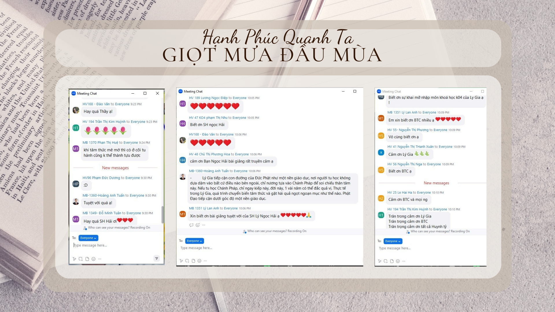 🌟 Tối qua, lễ Khai giảng khóa học HPQT K04 và Buổi học số 1 đã được diễn ra với sự tham gia của hơn 250 học viên và HĐ Lý Gia. Chỉ trong vỏn vẹn hơn 1 tiếng, rất nhiều những băn khoăn của người tu học đã được làm sáng tỏ, mở ra một cách nhìn hoàn toàn mới về Phật Pháp.